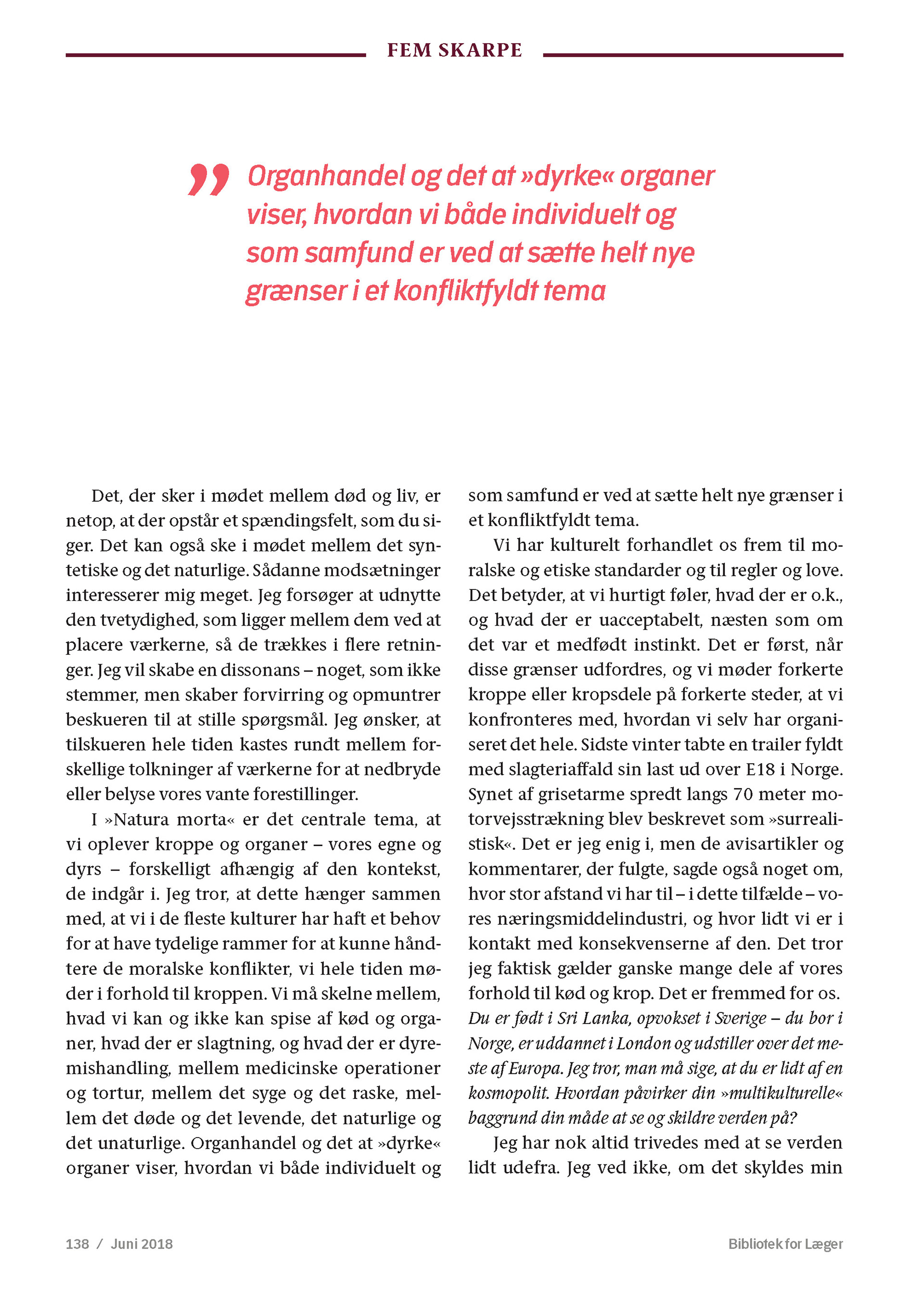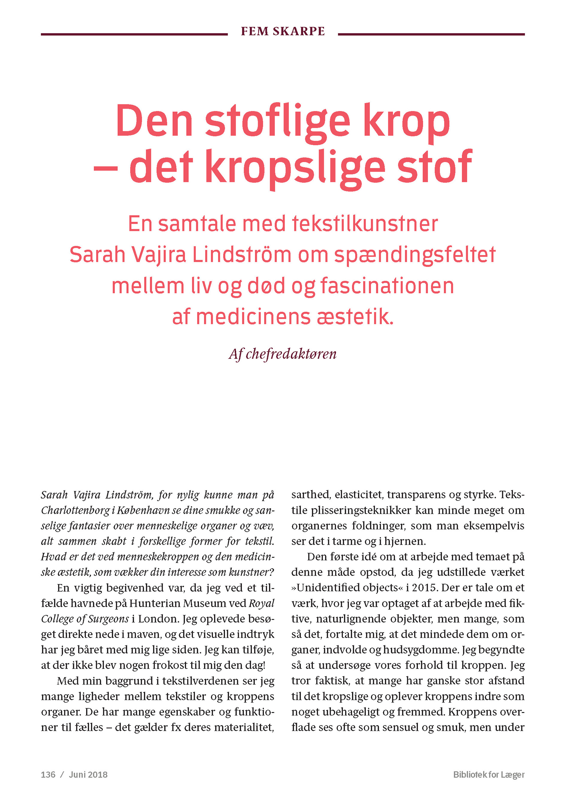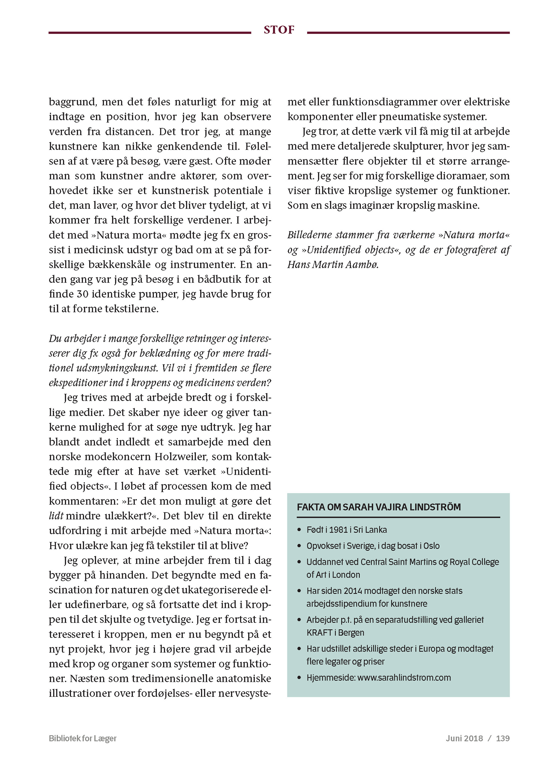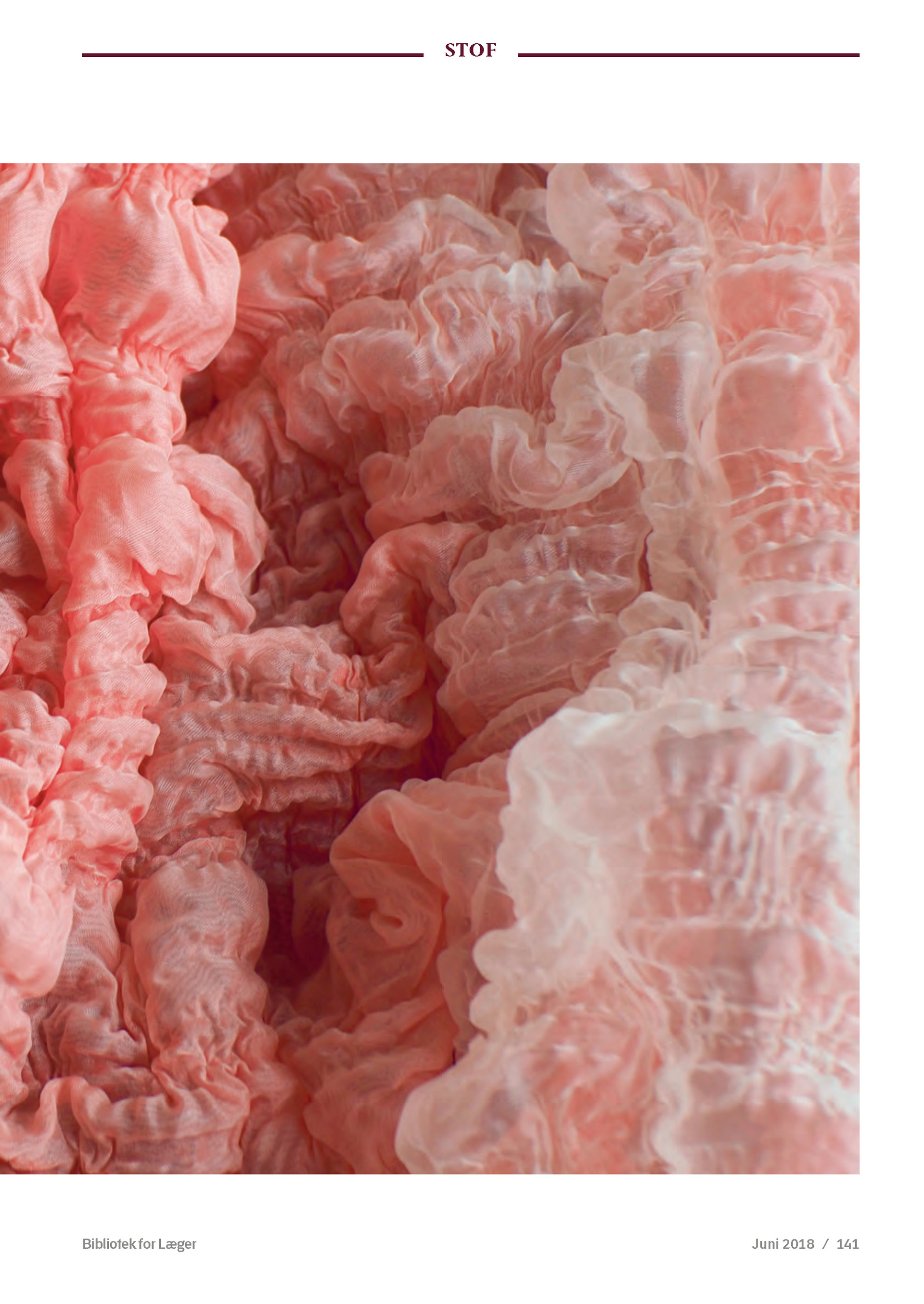 Også norske Sarah Vajira Lindström arbejder med et udtryk, der befinder sig i spændingsfeltet mellem gru og stor skønhed, ligesom også hendes installatoriske bidrag fremviser organismen hudløst – næsten i bogstavelig forstand. ‘Natura Morte (Still Life)’ består således af en række let gennemsigtige poser, der minder om membraner af en slags, fremlagt på klinisk rustfrit stål.